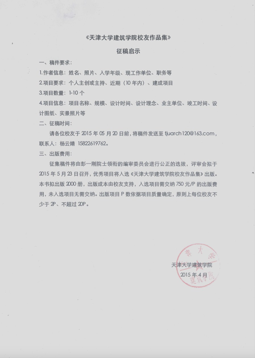 请各位校友于2015年06月01日前,将稿件发送至tjuarch120@163.com,稿件需提供项目原始资料及作者资料,无需排版。联系人:杨云婧 15822619762。