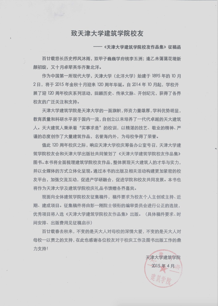 尊敬的各位校友,自《天津大学建筑学院校友作品集》征稿开始,短短几天,我们已经收到近百位校友的作品及投稿意向,在此,衷心的感谢各位校友的支持。值此母校120周年校庆之际,为更加全面展示建筑学院形象,展示校友实力,本次征集面向全体校友,并将截稿时间延至2015年6月1日,期待各位校友的作品!