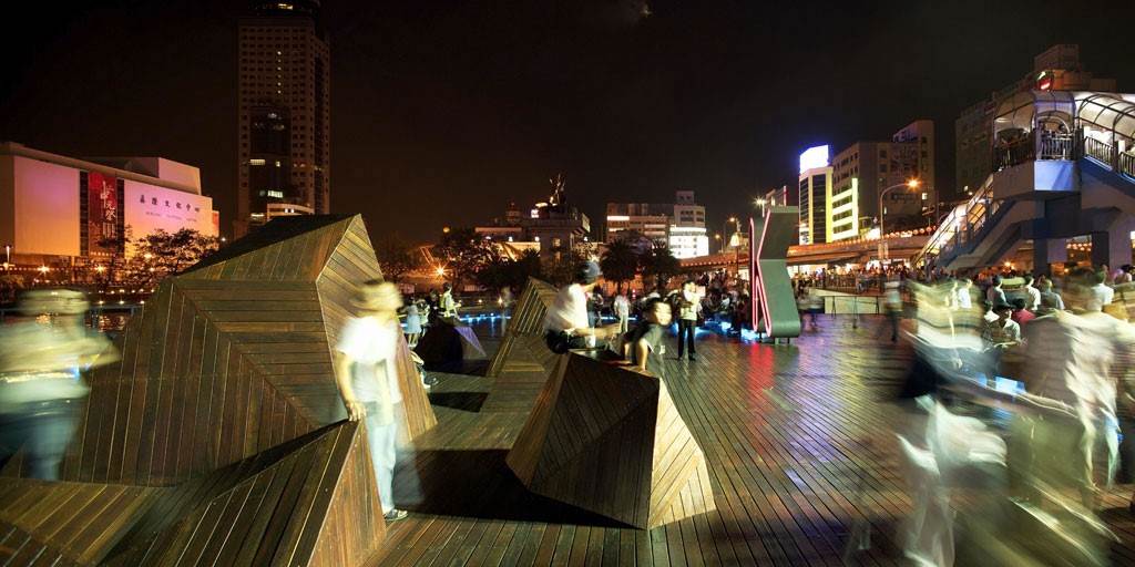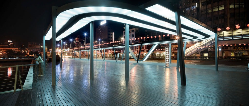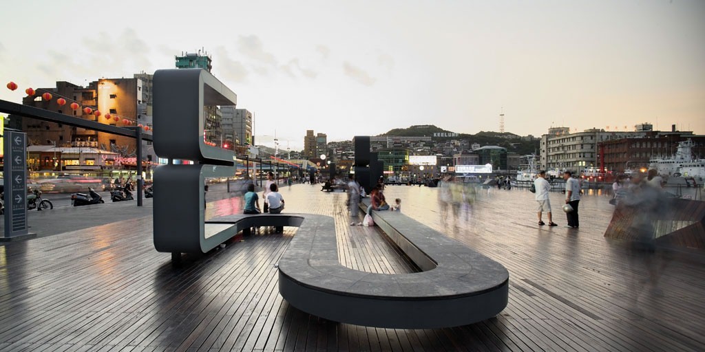 走廊式凉亭的形态犹如海洋植物触角般的复叶,被横向与纵向折叠成海边的休憩地,同时在面向市中心的位置拼出K-E-E-L-U-N-G。木质平台就像基隆港的著名码头一样吸引着来来往往的目光。