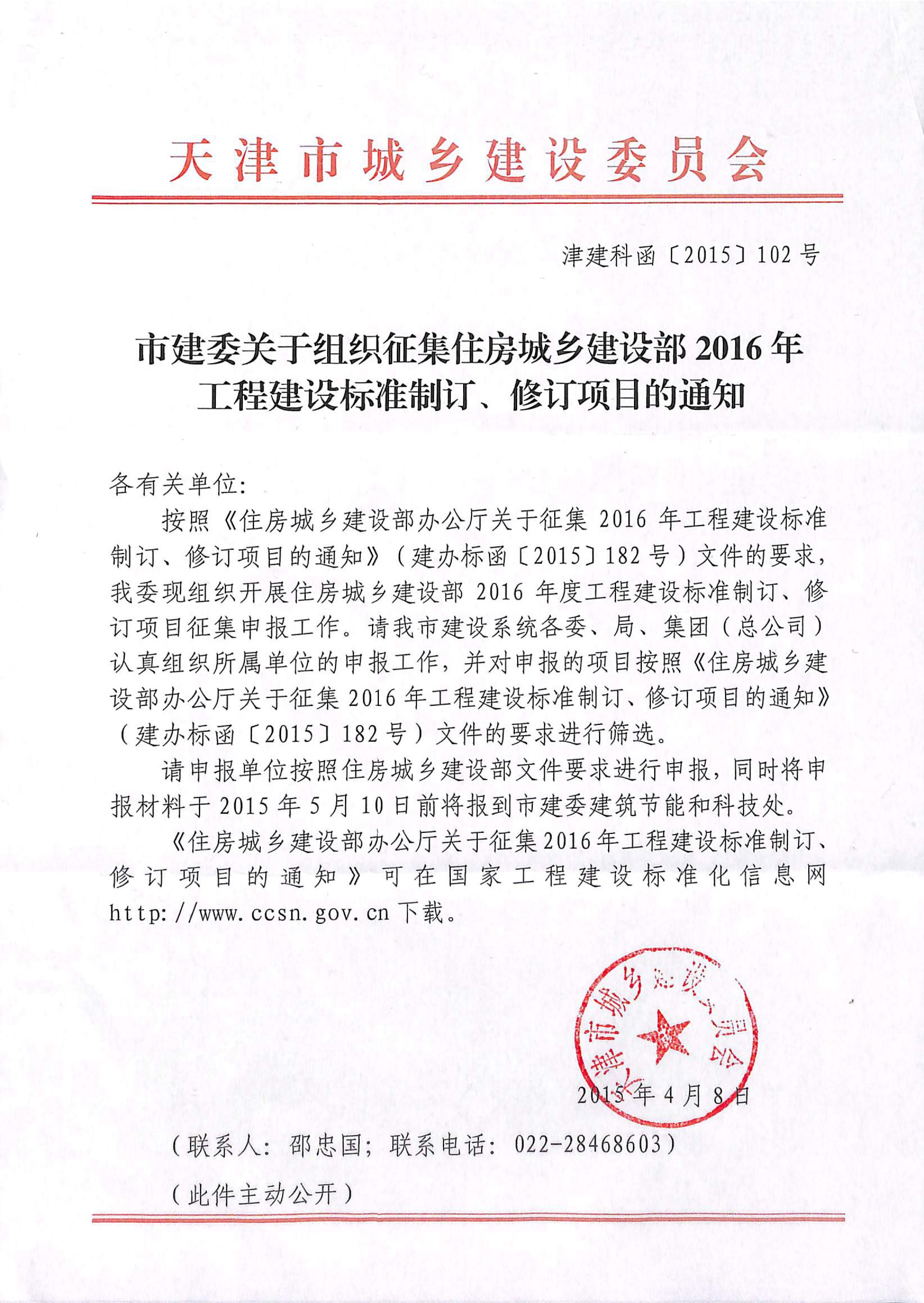 为完善工程建设标准体系,经研究,决定开展2016年度标准制订、修订项目征集工作。有关事项通知如下:
