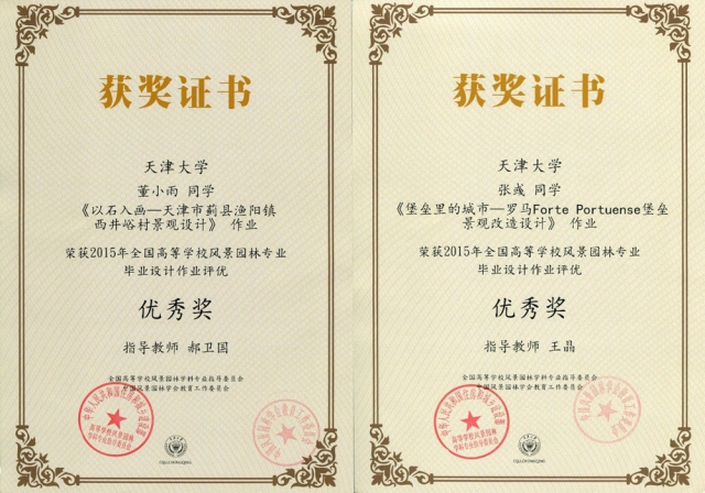 【我院2件学生毕业设计作业入选“2015年全国高等学校风景园林专业毕业设计作业评优”】2015年9月18日,由中国风景园林学会教育工作委员会、全国高等学校风景园林学科专业指导委主办,重庆大学承办的2015年“首届全国高等学校风景园林专业优秀毕业设计作业评优”结果揭晓。我院学生董小雨(指导教师:郝卫国)的毕业设计《以石如画——天津市蓟县渔阳镇西井峪村景观设计》与张彧(指导教师:王晶)的毕业设计《堡垒里的城市——罗马Forte Portuense堡垒景观改造设计》入选“2015年全国高等学校风景园林专业毕业设计作业评优”。据悉,此次共有全国46个建筑类、林农类和艺术类院校120份本科生毕业设计作业参加了展评,最终选出优秀作业30份。(环境设计系 供稿)