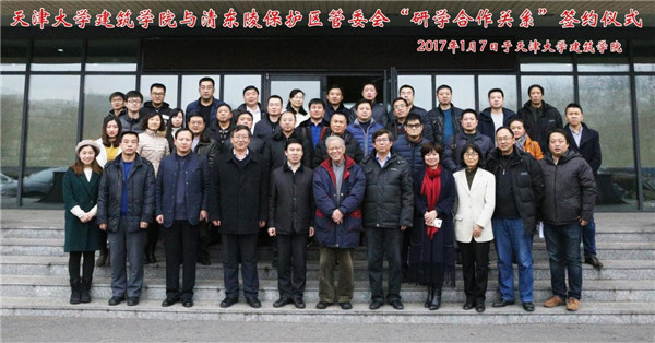 【清东陵保护区管委会与天津大学建筑学院“研学合作关系”签署仪式暨清东陵建筑、景观、文化战略发展研讨会成功举行】为了进一步提高清东陵在“研究、保护、利用”方面的工作水平,充分发挥天津大学建筑学院在古建筑科学研究上的智力优势,2017年1月7日,唐山清东陵保护区管委会刘金柱主任一行26人到访天津大学建筑学院,签署了“研学合作关系”协议并召开了清东陵建筑、景观、文化战略发展研讨会。