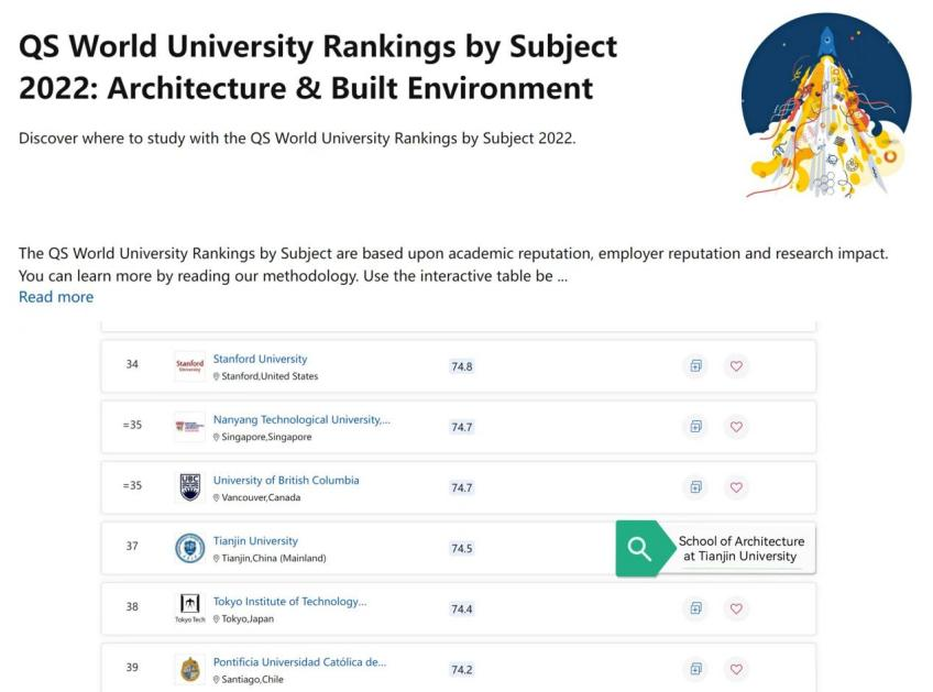 建筑学院国际声誉显著提升,跃升国际建筑院校前列。在2022年3月发布的QS世界大学学科排名中,天津大学在“建筑与建造环境”学科中位列全球第37名,在中国大陆建筑类高校中位列第3。