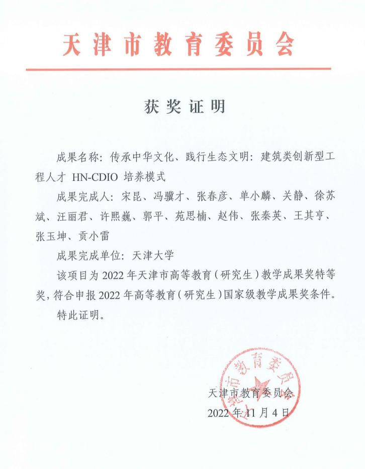《传承中华营建体系的建筑类卓越人才培养模式创新与实践》项目,获2022年高等教育(本科)天津市级教学成果特等奖;《传承中华文化、践行生态文明:建筑类创新性工程人才HN-CDIO培养模式》项目、《“积微成著 笃行致远 惟实励新”《建筑类型学》教材与课程思政建设》项目,分获2022年高等教育(研究生)天津市级教学成果特等奖。三个项目分别申报国家级教学成果奖。