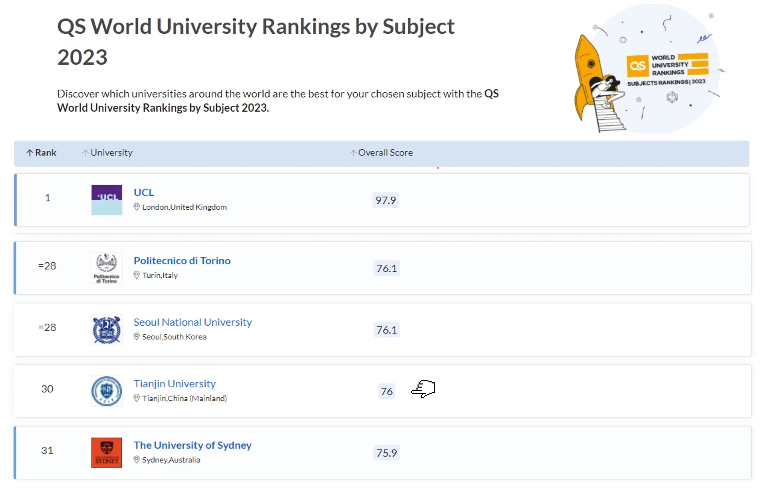 (1)“建筑与建造环境”学科位列QS全球世界大学学科排名第30名