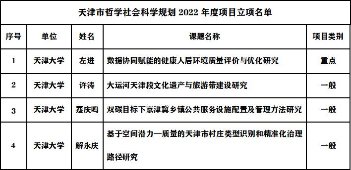 日前,根据《天津市哲学社会科学规划项目管理办法》等有关规定,天津市哲学社会科学工作领导小组办公室公布了天津市哲学社会科学规划2022年度项目立项名单。我院教师积极申报了9项课题,获批4项课题,立项率达44%。获批的4项课题中,包括重点项目1项、一般项目3项。