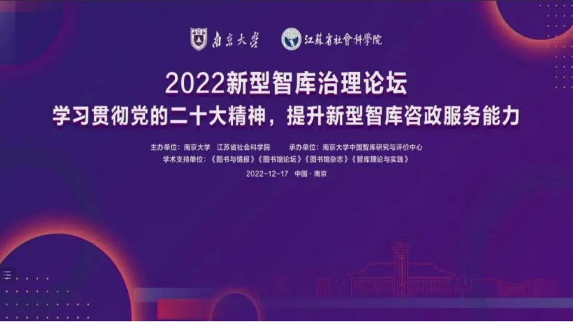 2022年12月17日,由南京大学与江苏省社会科学院联合主办的“2022新型智库治理论坛”在南京举行。本届论坛聚焦“学习贯彻党的二十大精神,提升新型智库咨政服务能力”主题,全国智库界、思想理论界专家和智库负责人等700余人通过线上线下的形式参会,认真学习贯彻党的二十大精神,报告中国特色新型智库的建设进展与先进经验,展示新时代新征程下中国特色新型智库在中国式现代化中的新担当新作为。