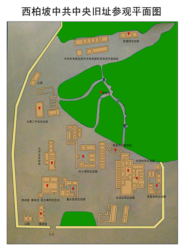 中共中央旧址大院,大门南向,分前后两部分。前院自东而西,是周恩来、任弼时、毛泽东、刘少奇、董必武的旧居,还有军委作战室旧址、中国共产党七届二中全会会址等。在后院东北角,三间窑洞式建筑是朱德的办公室、休息室和会客室的旧址。