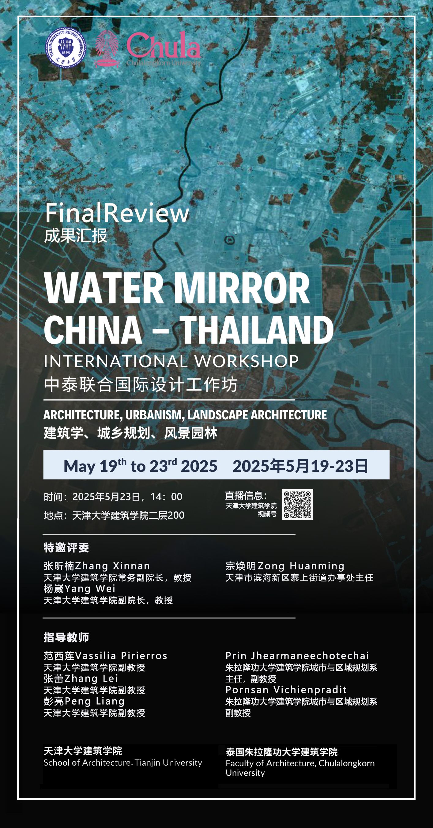2025年中泰联合国际设计工作坊由天津大学建筑学院与泰国朱拉隆功大学建筑学院共同举办,工作坊以同为滨海城市的中国天津和泰国曼谷为比较研究对象,以同一设计主题,引导学生重新思考东亚海岸的建筑、城市与景观。工作坊已于2025年1月13-17日在泰国曼谷朱拉隆功大学举办了为期5天的第一阶段。第二阶段于2025年5月19-23日在天津大学建筑学院举办,以天津市滨海新区大神堂村为设计研究对象,探索天津滨海地带的文化景观保护、旅游休闲、城市与建筑、生态修复、气候变化与适应性设计等课题。