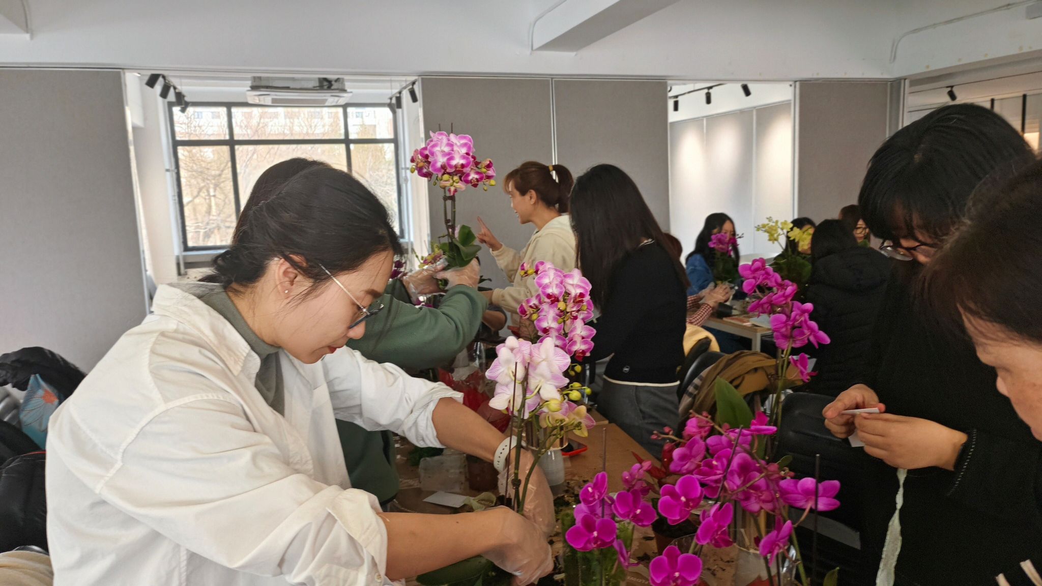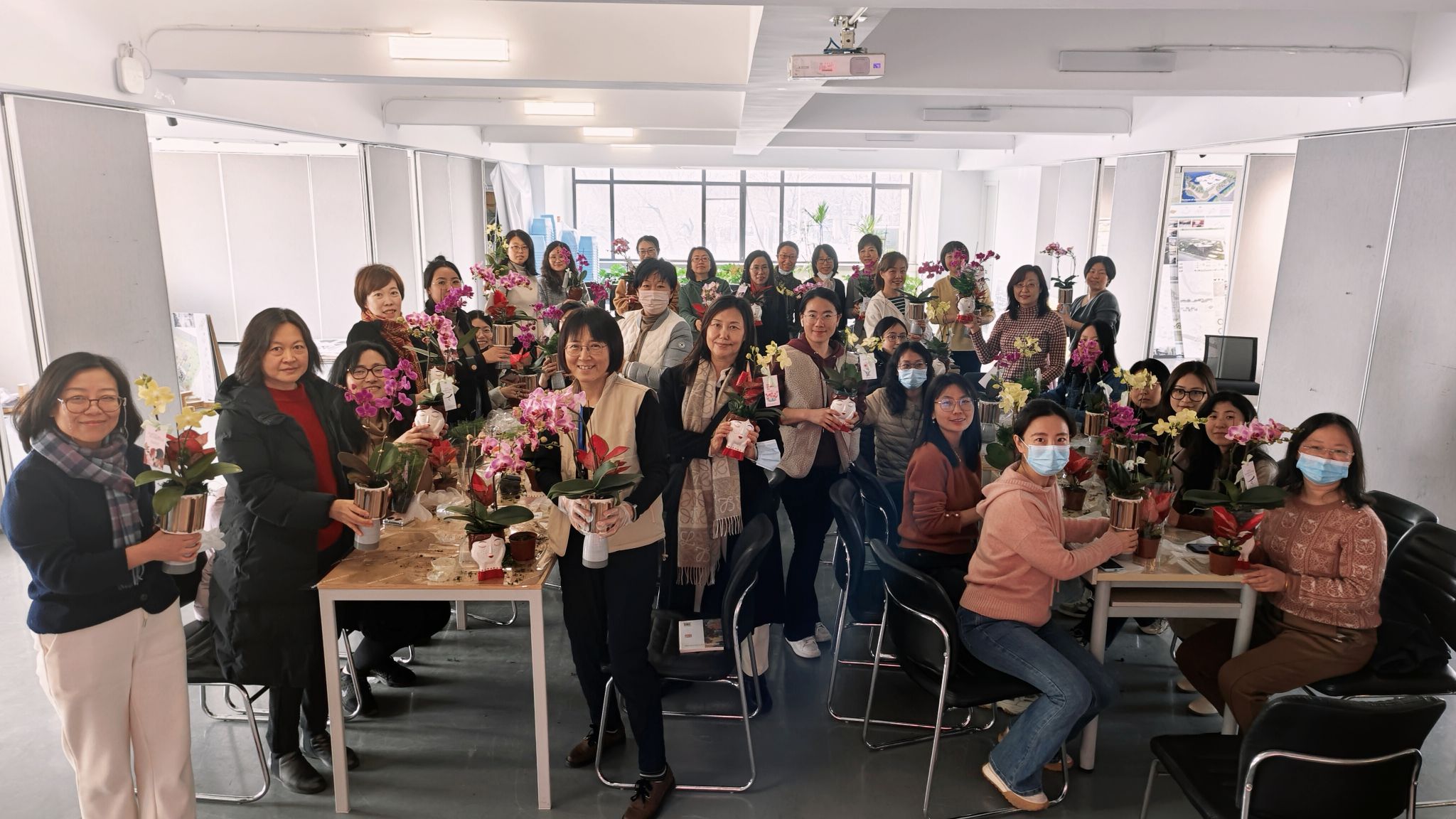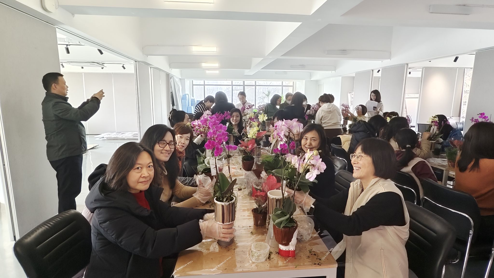 活动现场,工会邀请了花艺师为大家讲解蝴蝶兰日常栽培、养护、繁殖以及与其他植物组合栽培技巧,并为大家准备了斑花、金蝶、金公主等不同品类供大家挑选搭配。在花艺师的指导下,一件件春意盎然、清新淡雅的蝴蝶兰盆景就制作出来了。大家说着、笑着,脸上都洋溢着浪漫幸福的笑容。老师们在感受美、欣赏美、创造美的过程中愉悦了身心、舒缓了压力,展现了建筑学院教职工积极向上的精神面貌和靓丽的风采。