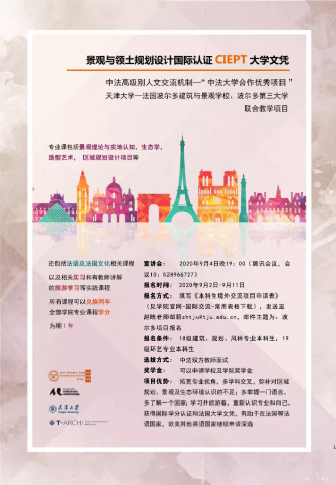有意向的同学请在2019年9月11日前,到建筑学院官网-国际交流-常用表格下载板块下载《本科生境外交流项目申请表》,发送至赵晗老师邮箱zhtju@tju.edu.cn,邮件主题为:波尔多项目报名。