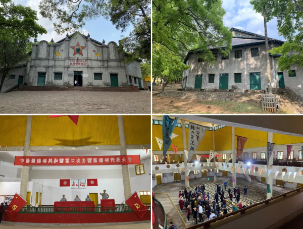 中华苏维埃共和国临时中央政府大礼堂位于瑞金城西6公里的沙洲坝镇茶亭村,大礼堂位于一片树林中,场地近似圆形,是一座中西合璧的建筑,既可以看到古罗马凯旋门的立面构图,也可以看到中国特色的大屋顶,造型美。建筑有三个特点:一、建筑平面以八边形应对圆形这一独特地形,满足了礼堂的声学与视线的要求。同时,在每个边上都设置门,满足了礼堂的疏散要求。二、鸟瞰整座建筑,中国传统屋顶的屋脊使得礼堂外观形似一顶红军八角帽。10根柱子撑起了建筑正中的庑殿顶,使得下方成为无柱大空间,满足礼堂的使用要求。三、采用八角形的斜边为入口,立面设计中凯旋门巨柱式的应用,结合三角形屋顶形态,使入口颇为大气,符合建筑的政治要求。在20世纪30年代设计出这样中西合璧的建筑,实属是思想与技术的进步带来的创新,反映了苏区党政军民开拓创新与打破传统的进步品质。
