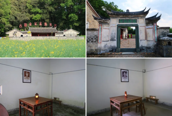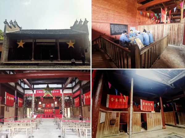 古田会议会场的陈设非常简单,两张八仙桌拼在一起就是讲台,几排长条凳摆放整齐就是坐席,厅前的廊柱上张贴着红军标语,地面石板上残留着炭火炙烤的痕迹,具有浓浓的革命气息,表现出革命的艰苦环境。