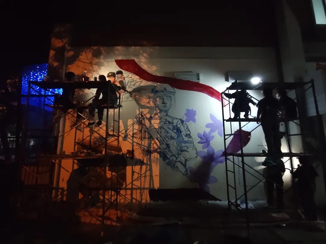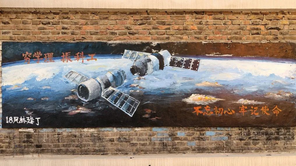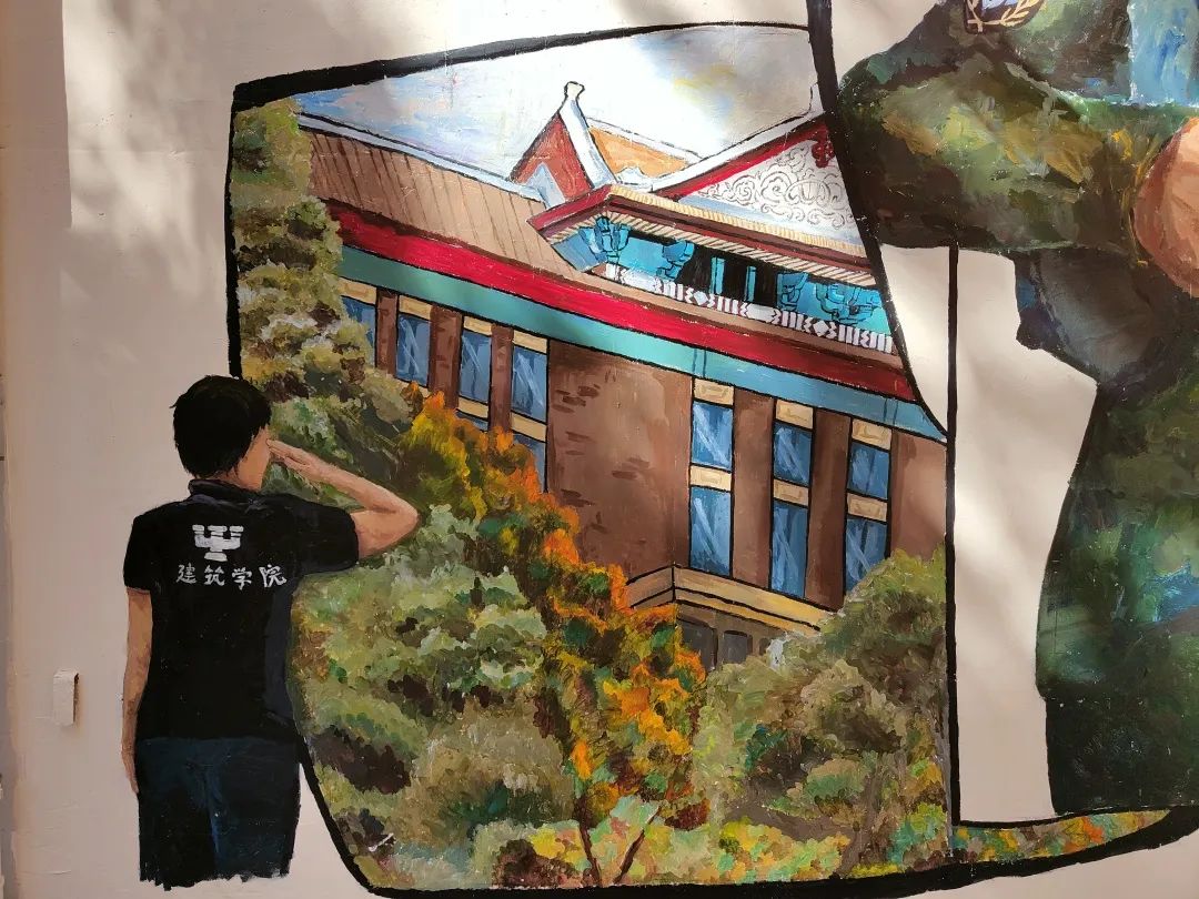 为了完成这幅墙绘,十余名同学爬上几米高的脚手架,从白天画到黑夜,用青春的汗水绘就了这幅巨作。