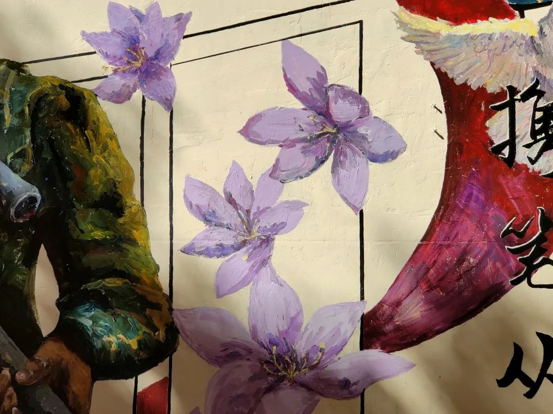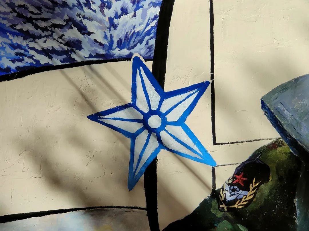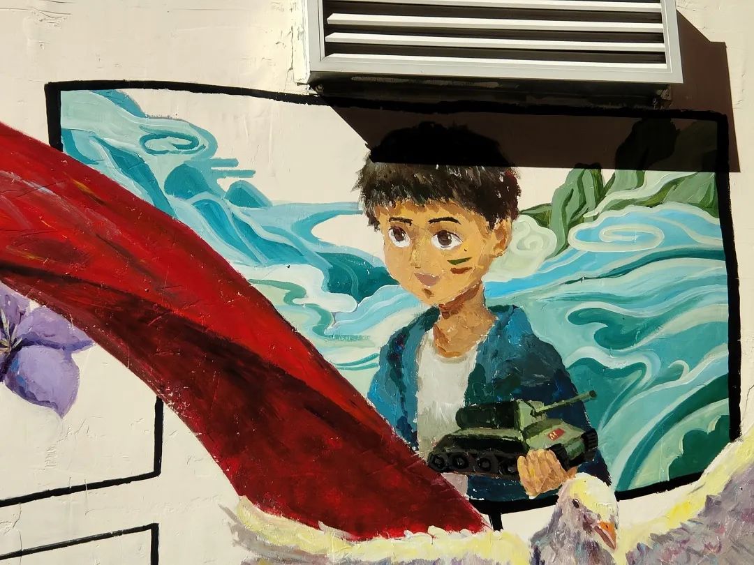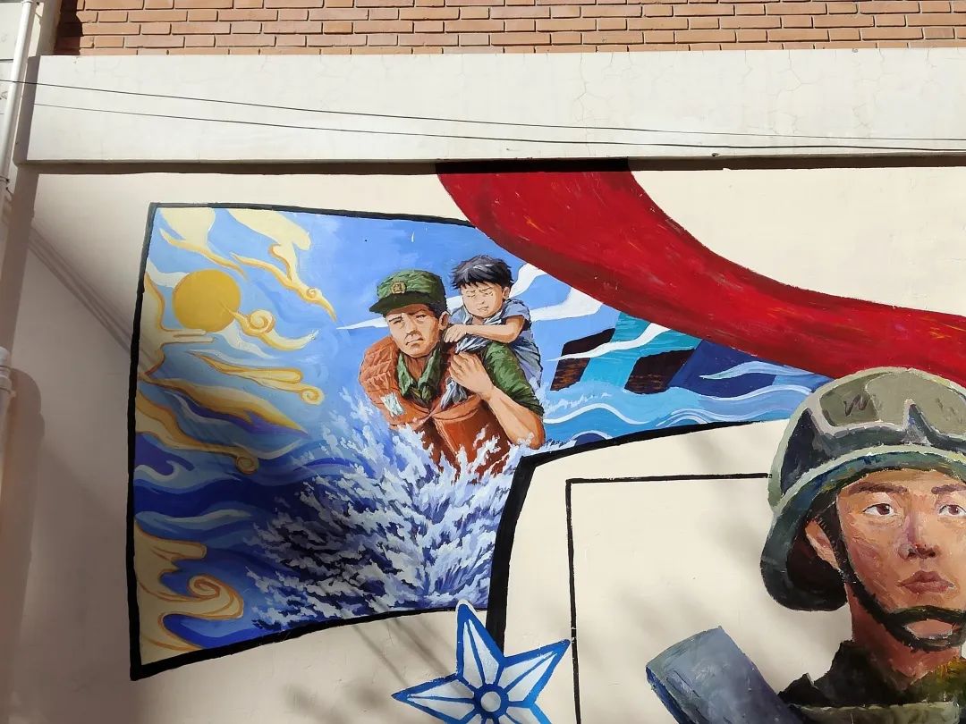 《携笔从戎,不负韶华》是一幅4.5米×7米的巨型墙绘,同时也是本次墙绘中工程量最大的作品,展现了一个稚嫩少年从幼时被解放军搭救,再到成为大学生,最后参军入伍、守卫家国的蜕变历程。
