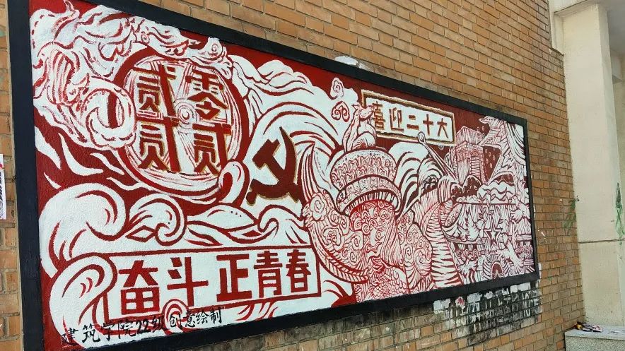 参与“喜迎二十大”主题墙绘的建筑学院2022级新生张丙照表示“和同学们一起以主题墙绘的方式迎接党的二十大胜利召开是一次难得的经历,素材整理、设计构图、绘制的整个过程也是我们来到天津大学后第一堂生动的实践课。”